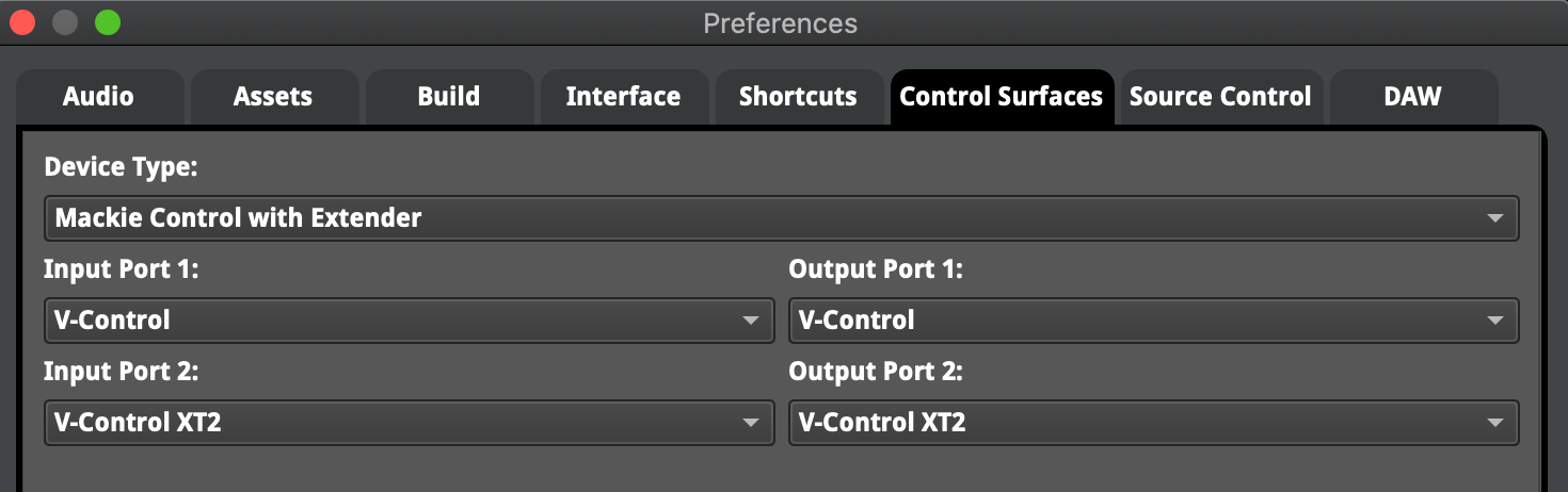 - Select the following for an 16 channel surface: Device Type: Mackie Control with Extender Input Port: V-Control Output Port: V-Control Input Port 2: V-Control XT2 Output Port 2: V-Control XT2 FMOD Mackie 1