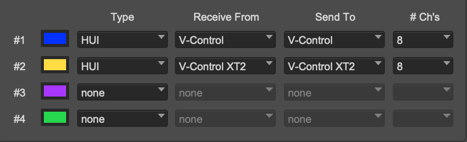 16 Channel Follow the instructions for 8 Channel setup then add the following: Click on the + sign to add additional control surfaces. Set the control surface as follows. Unit: Expander (XT) Input: V-Control XT2-1 Output: V-Control XT2