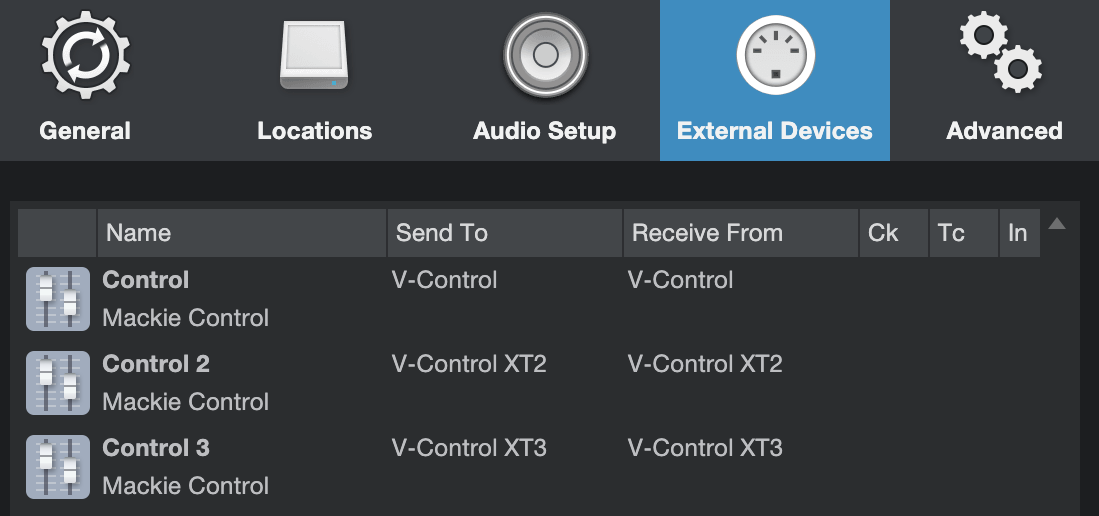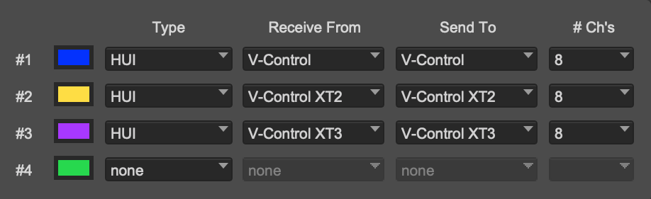 Toggle On for Remote for the following: Input: MackieControl Input (V-Control) Output: MackieControl Output (V-Control) Control Surface: MackieControlXT Input: V-Control XT2 Output: V-Control XT2 Control Surface: MackieControlXT Input: V-Control XT3 Output: V-Control XT3 Toggle On for Remote for the following: Input: MackieControl Input (V-Control) Input: MackieControlXT Input (V-Control XT2) Input: MackieControlXT Input (V-Control XT3) Output: MackieControl Output (V-Control) Output: MackieControlXT Output (V-Control XT2) Output: MackieControlXT Output (V-Control XT3) 16 Channel Follow the instructions for 8 Channel and do the following: Add the addition row to the control surface setup: Control Surface: MackieControlXT Input: V-Control XT2 Output: V-control XT2