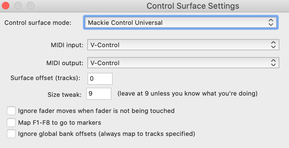 - Select the following in the Control Surface Settings Window: Control Surface Mode: Mackie Control Universal MIDI Input: V-Control MIDI Output: V-Control