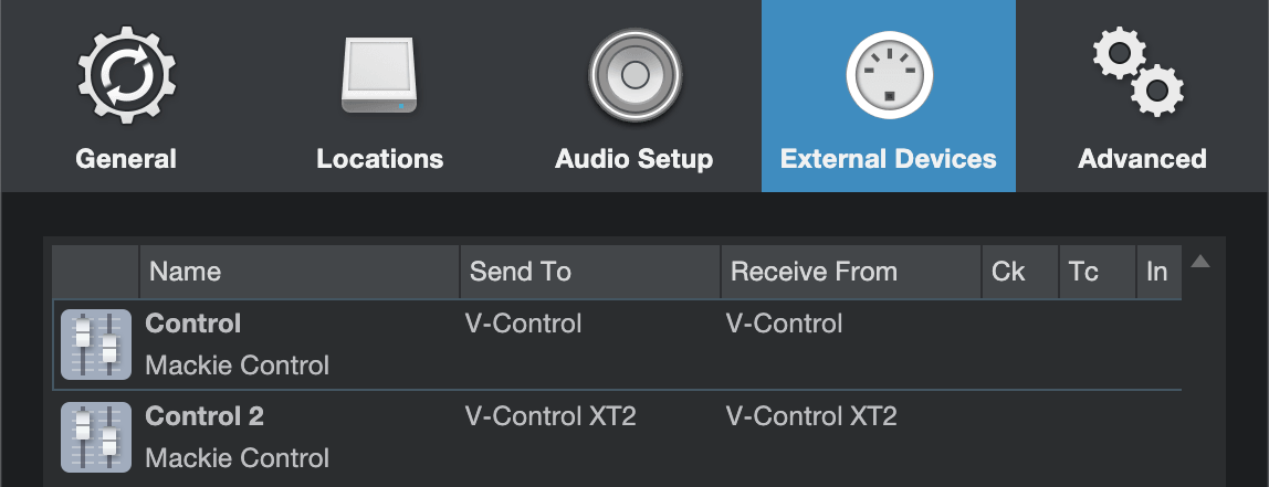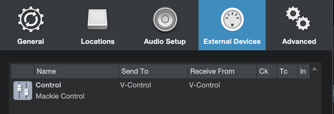 Launch Studio One In the Studio One top menu bar select: Studio One / Preferences... Select External Device on the preferences window Select "Add Device" and choose the following: Mackie/Control Receive From: V-Control Send To: V-Control