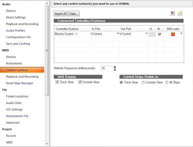 - In the Sonar top menu bar go to: Edit / Preferences / Control Surfaces...