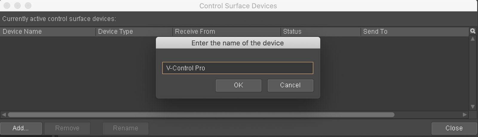 - Click on "Add" and select the following: Manufacturer: Mackie Model: Control Input: V-Control Output: V-Control