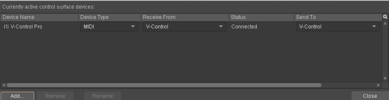 - Configure for Connected Controllers/Surfaces as follows: Controller/Surface: Mackie Control In Port: V-Control Out Port: V-Control